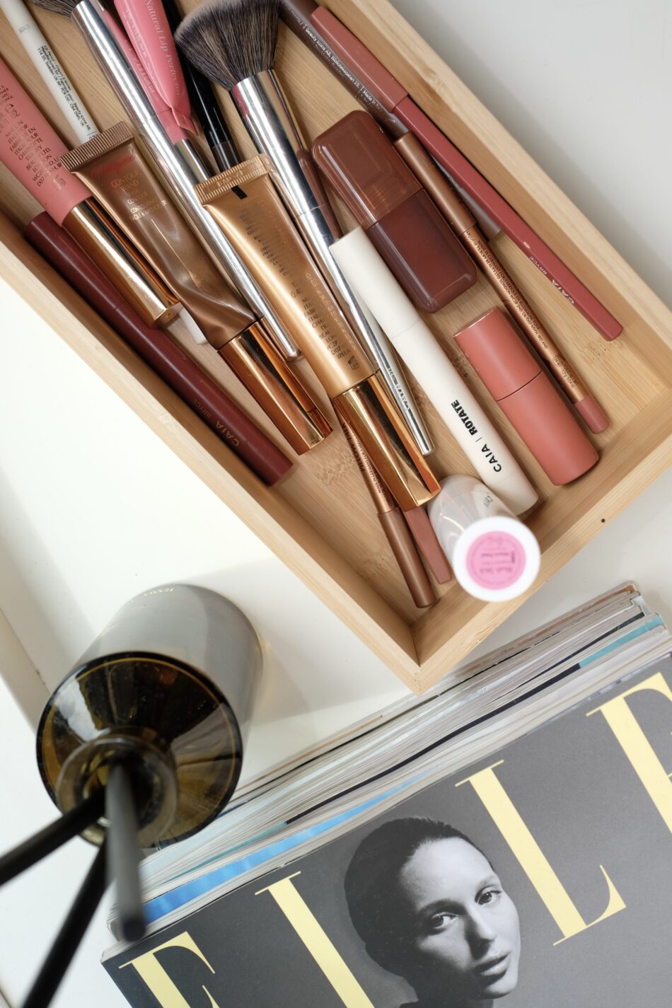 Makeuppen er enkel, og jeg bliver altid draget mod bronze- og terracottatoner, fordi jeg synes, de fremhæver min olivenfarvede undertone på en naturlig måde. Jeg starter med concealer og derefter bronzer – altid i cremeform. For tiden bruger jeg ‘Hollywood Contour Wand’ fra Charlotte Tilbury som bronzer og ‘Auto Pen’ fra Nilens Jord til at forme og fiksere mine bryn.
